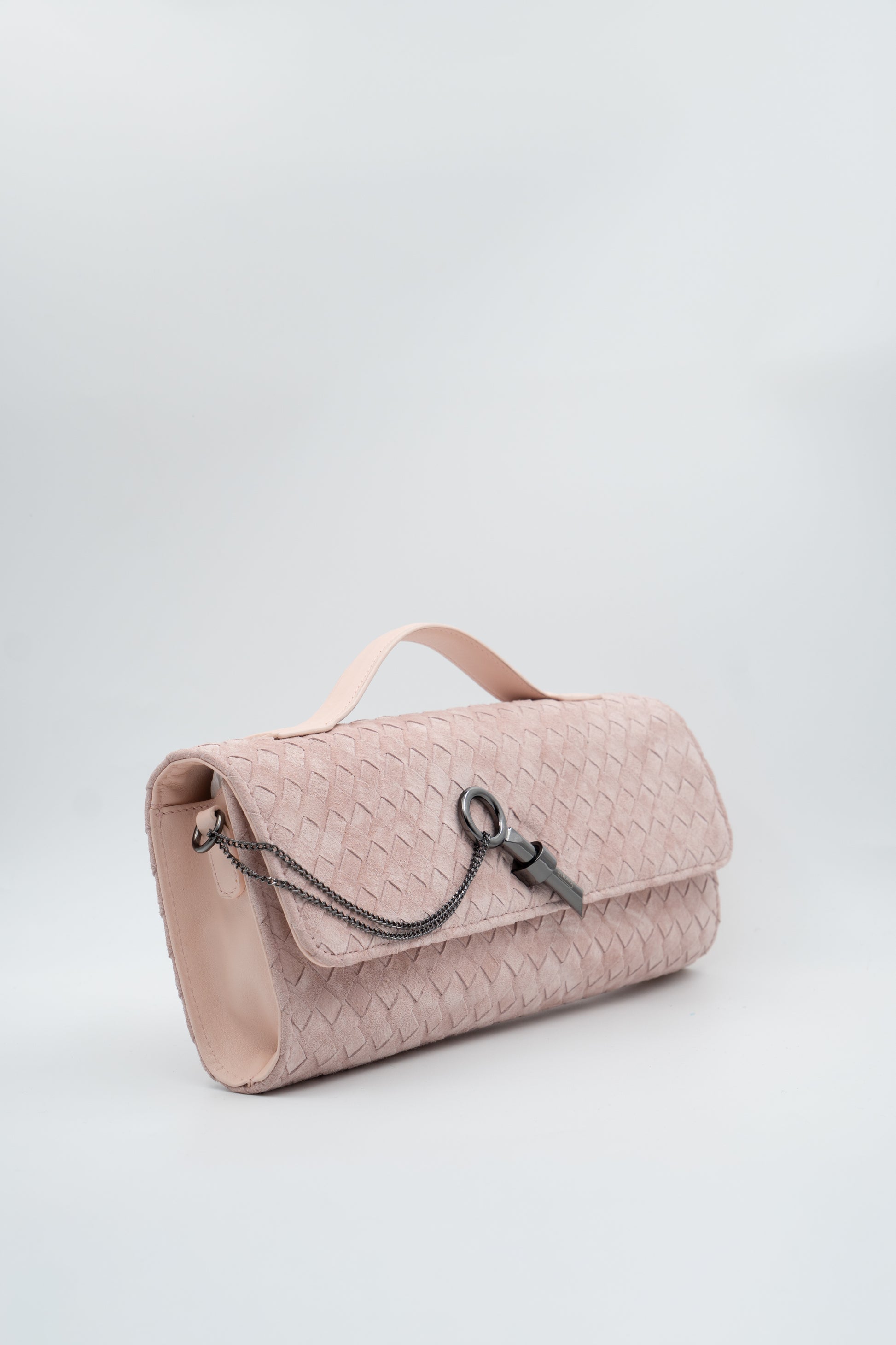 Nossa clutch em couro legítimo de camurça tressê tem um formato que é puro charme, trazendo uma textura suave, macia ao toque e com um caimento estruturado que valoriza ainda mais o material.