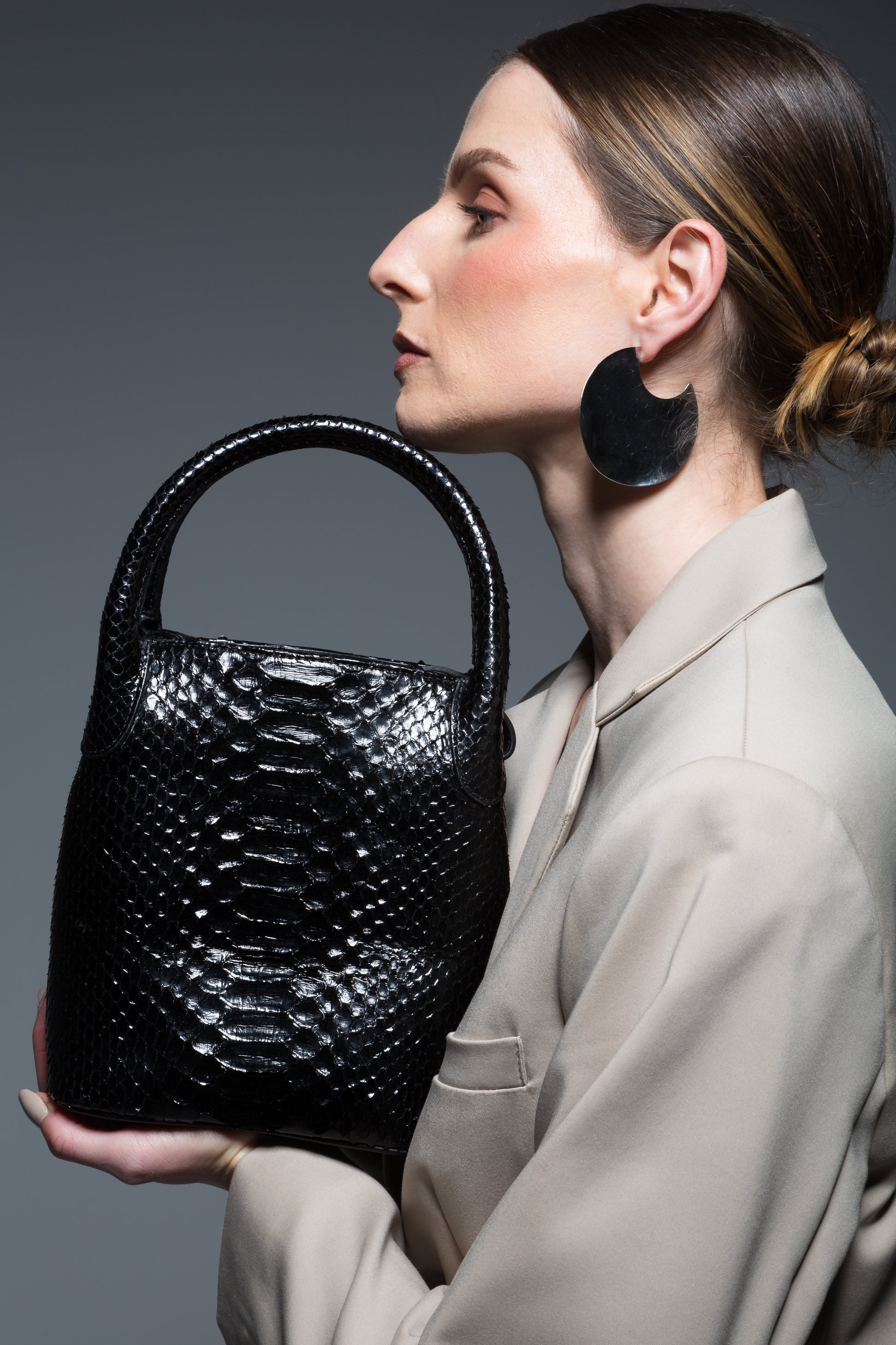 Um design autoral com aura de poder. A Teca em couro de python preto é imponente na medida certa: minimalista no formato, mas impactante na textura e no acabamento. A alça estruturada realça a arquitetura da peça, enquanto a alça longa traz praticidade para o dia a dia sofisticado.